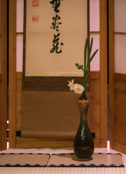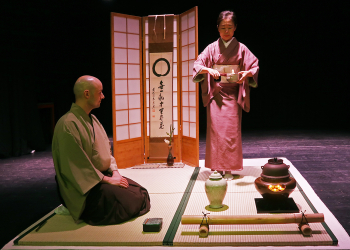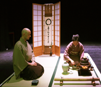 Auf der kleinen Theaterbühne erschien an diesem Abend ein bezaubernder Teeraum, dessen Zubehör Mulan Sun Buschor aus ihrer Winterthurer Tee-Schule Kōshin-an (向心庵) nach Zürich mitgebracht hatte. Die Teemeisterin, Zen-Meditierende und Architektin liess uns in der japanischen Teezeremonie Zen im Alltag sinnlich und spirituell erleben.